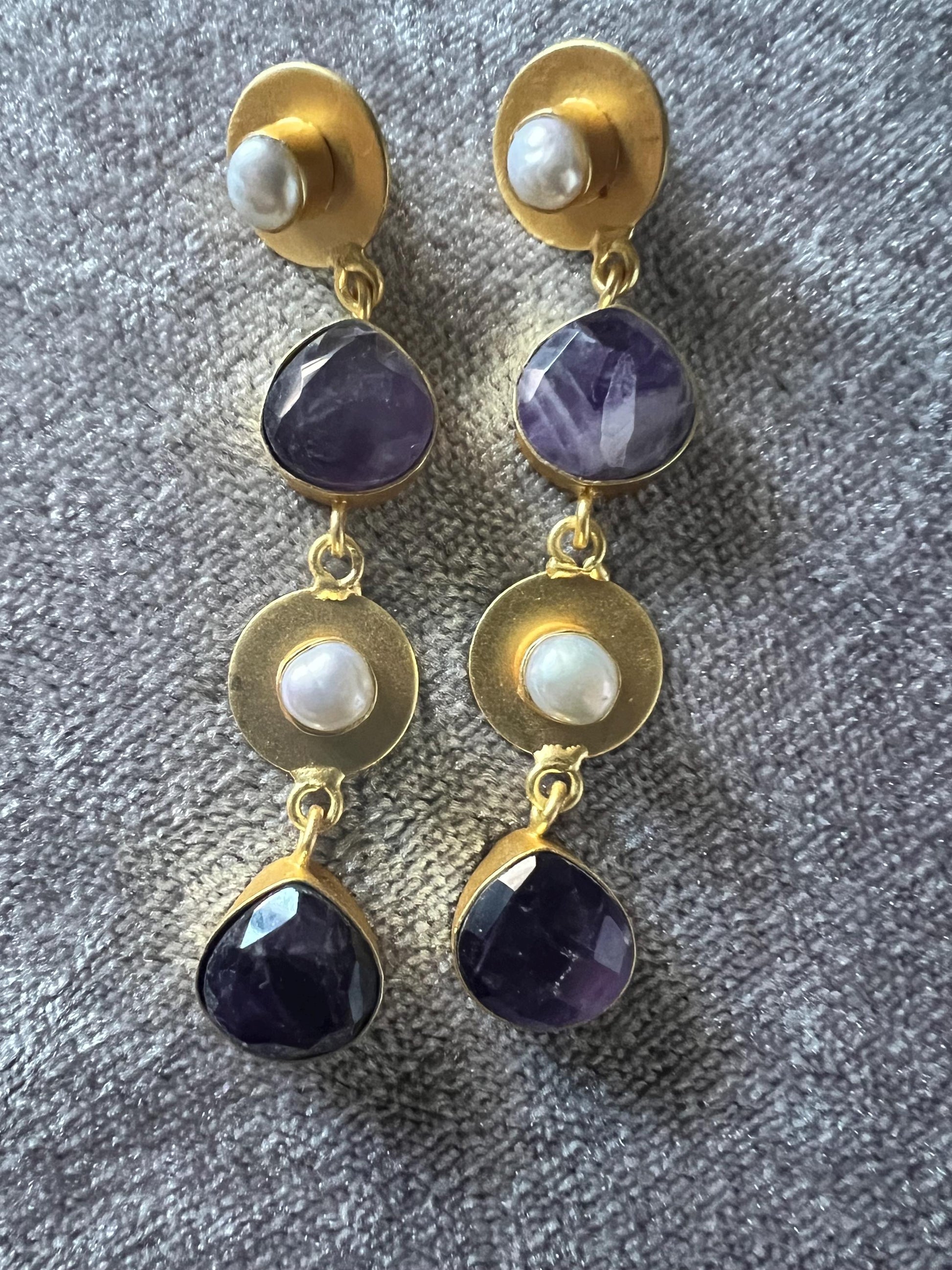 Stunning dangler earrings with pearl and gemstone. Currently available in lovely amethyst. classic black onyx or stunning aquamarine.