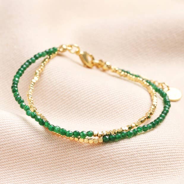 Green Semi-Precious Stone Layered Beaded Bracelet in Gold