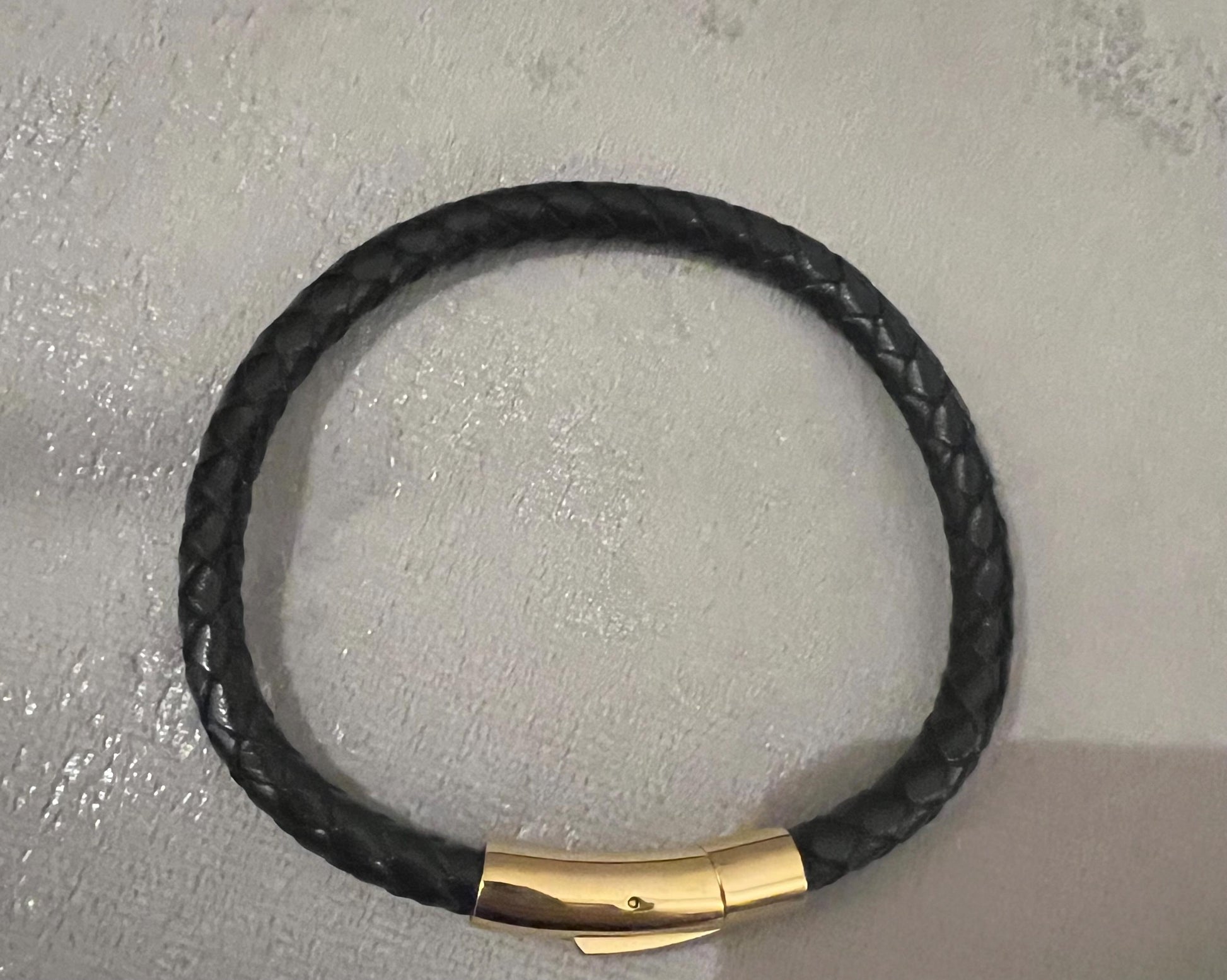 Men’s leather bracelets with stainless steel bar. Bar opens up and clips into place to easily slide on.