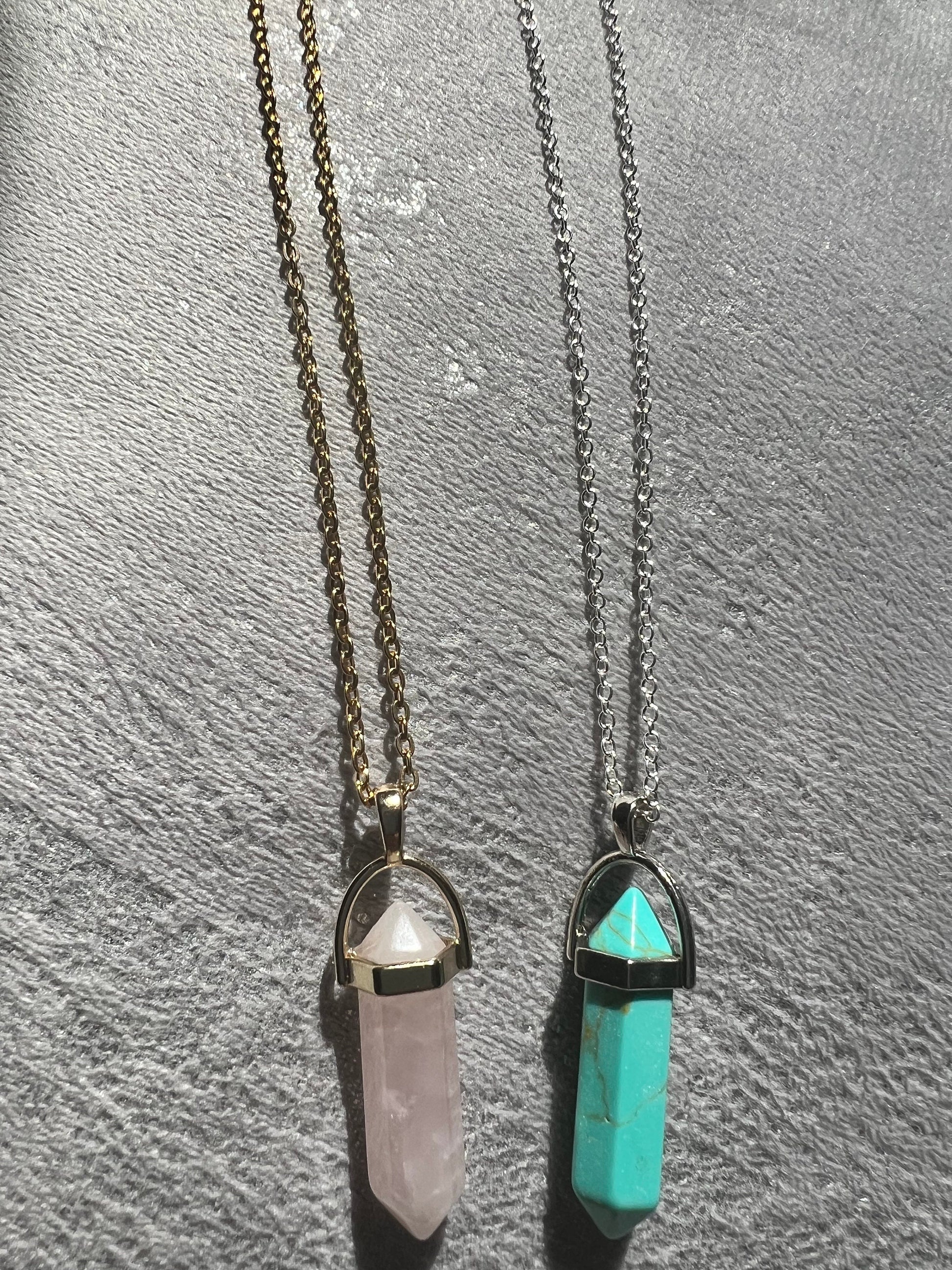 Protective Rose Quartz pendant with gold chain.