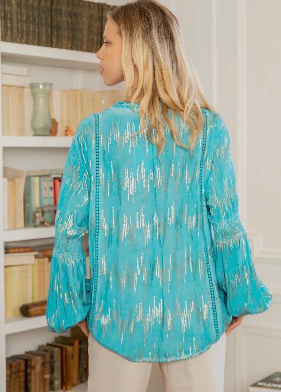 Turquoise & Gold Foil Lantern Sleeve Blouse – Women's Shirt (Sizes S, M, L)